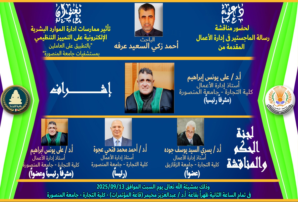 11 سبتمبر,2025 مناقشة الباحث : أحمد زكي السعيد عرفه -الماجستير فى ادارة الأعمال - السبت 13 سبتمبر 2025