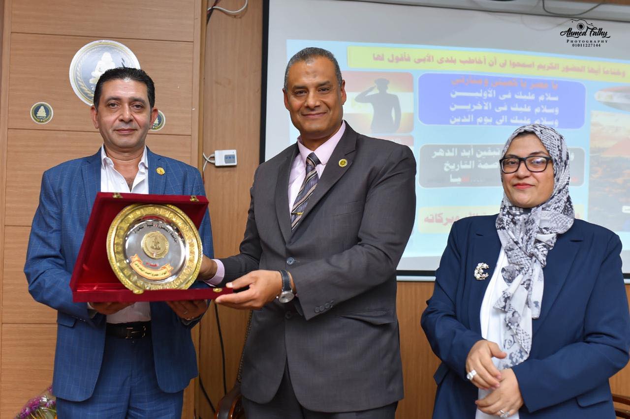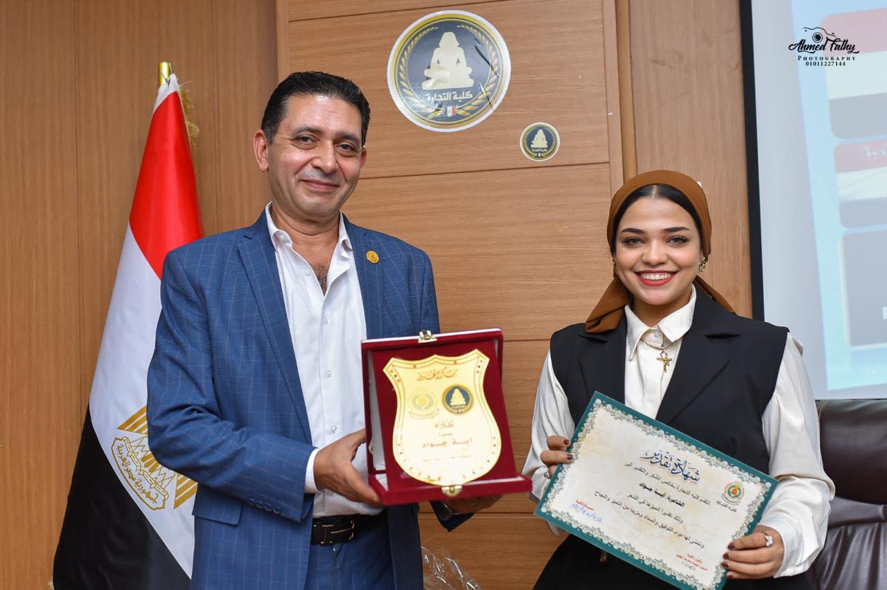 وفي ختام الفعالية، قام الأستاذ الدكتور/ أحمد مطاوع – عميد كلية التجارة بإهداء درع الكلية إلى اللواء أركان حرب/ عمرو أحمد البغدادي تقديرًا لمشاركته القيمة وإسهاماته المتميزة في إثراء الوعي الوطني لدى طلاب الجامعة.